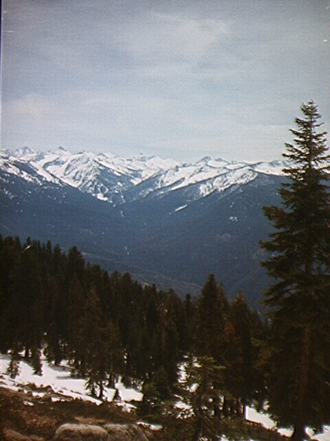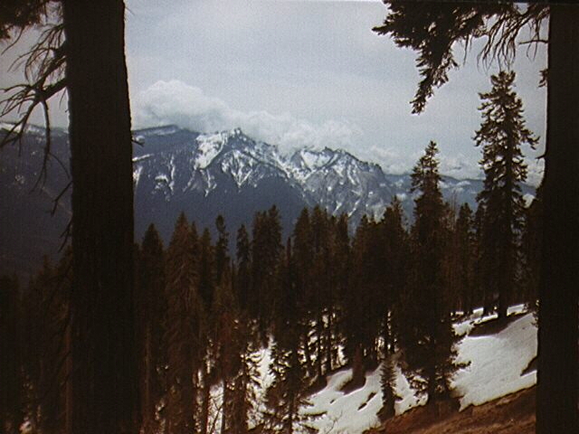 Two and a half hours later I stood triumphanly on top of........Peak 9975!.......Where the F' was I? After walking for a few feet out of the trees Alta Peak stood right before my eyes, with only 1000 feet and a class 3 ridge separating me from my goal. This of course was not the way I intended to go, especially if I wanted to catch up with the other guys. The numerous pinnacles and turrets projecting from the snow along the ridge would have made a solo traverse a deadly one, and with that thought in mind I headed down to Mehrten Meadow, carefully looking for the tracks that would have announced anybody else's presence, but with no luck. At 12:30 I stopped for lunch where the trail crosses the creek. While eating I began to witness a most interesting phenomenon. Clouds from the valley were blowing into Middle Fork Valley and up the sides of the canyon, similar to what the fog does. More interesting was the fact that as the clouds gained altitude they grew larger and larger. I sat for over half an hour watching the clouds. Soon Tharp's Rock was obstructed, only the small southern pinnacle visible.